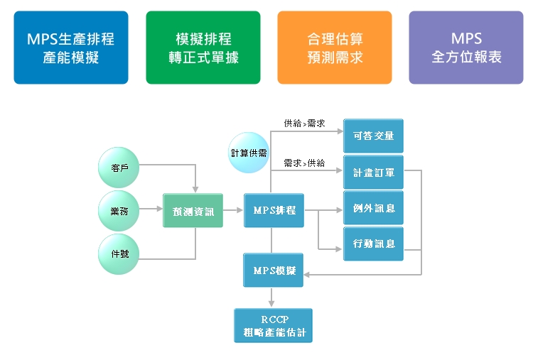 ☺【MPS生產排程】產能負荷模擬分析管理。 ☺可依Forecast量及實際訂單,進行【MPS生產模擬排程】。 ☺多時段估算成品需求量、預估產能、合理分析產量。 ☺MPS模擬排程資料正確,可轉至正式生產排程,省時省力。 ☺【MPS模擬產能不足】可轉生產/加工工令、請採購。 ☺全面提供模擬在途量報表、 MPS報表、 TPOP報表。
